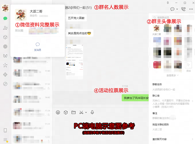 分享个人游戏微信群内为活动拉票的截图,截图需清晰展示微信号,以证明您为该社群管理员,且社群人数需满足五十人以上。具体示例可参考以下示意图,快来发动社群力量,为活动助力吧!
