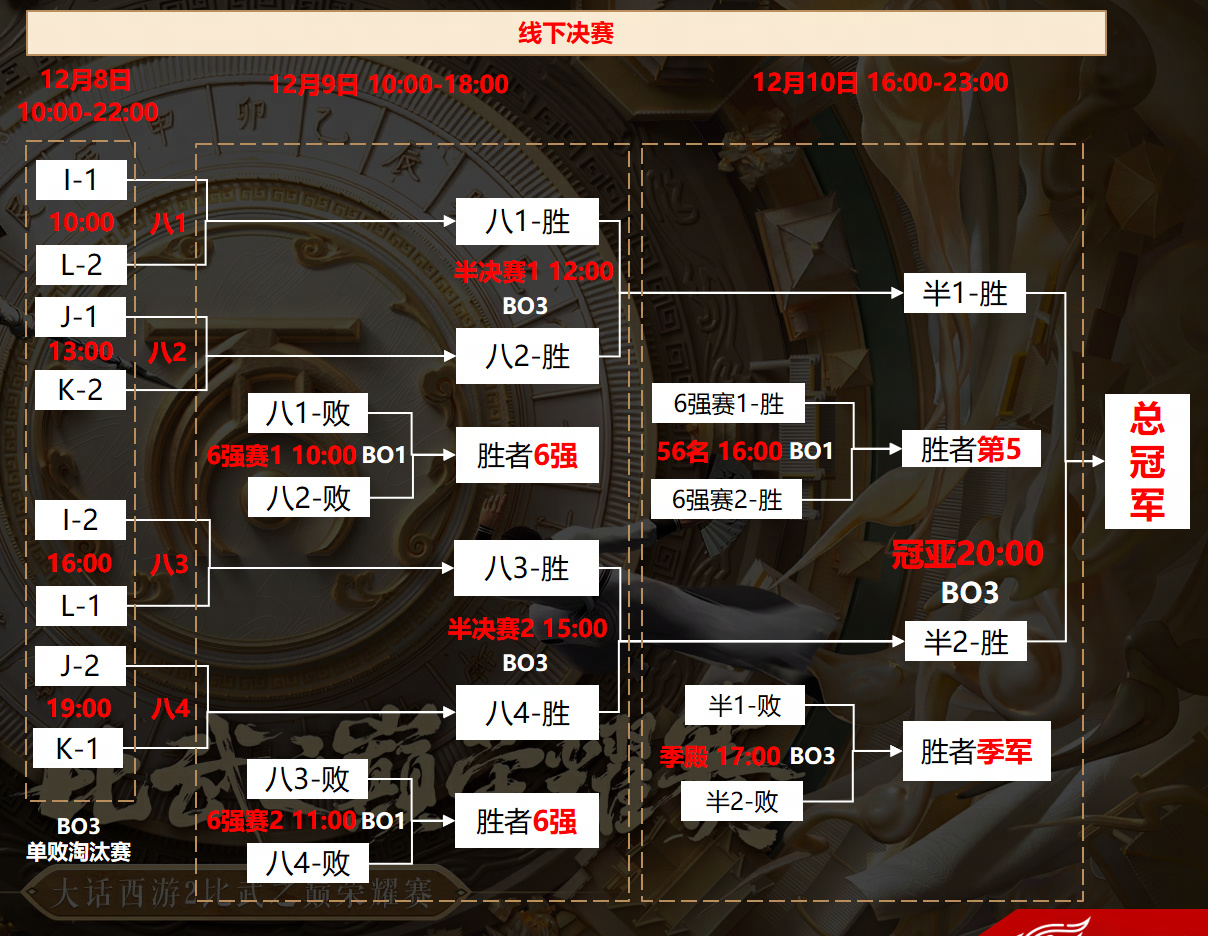 2、线下赛首轮将根据8强抢位赛中各晋级队伍的组内名次进行对阵分布,获胜的队伍将进入半决赛淘汰赛,失败的队伍将继续进行6强赛与5/6名决赛的对阵。