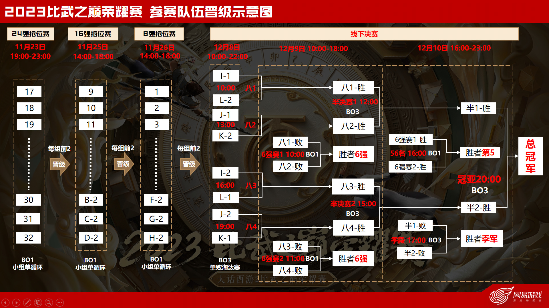 1、线下总决赛赛程如图所示,本阶段将进行单败淘汰赛,除6强赛与5/6名决赛外,均为三盘两胜赛制。