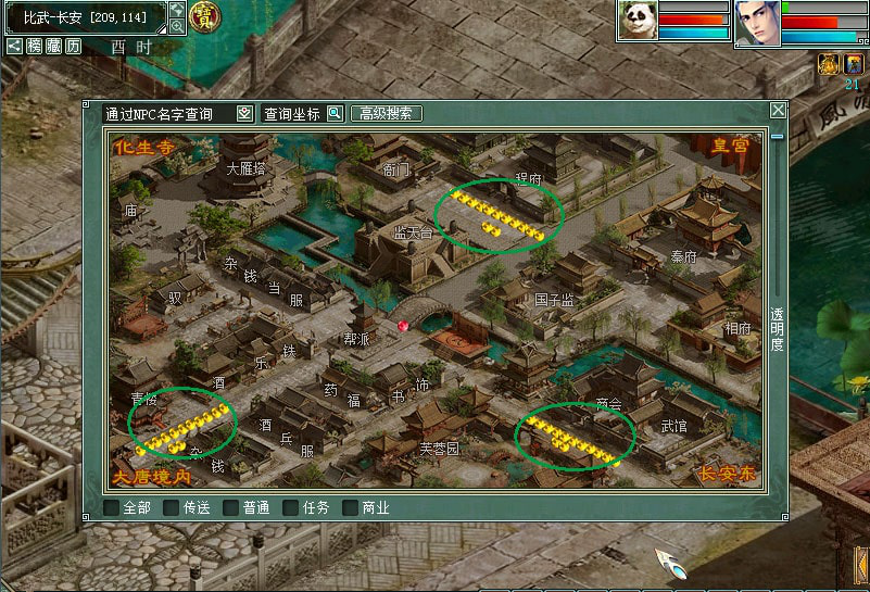 比赛专服一共有3个场景,分别是“比武-长安”“比武-洛阳城”“比武-宝象国”,每个场景均有3组用于配置账号、进行参赛确认的NPC。玩家可以在3个场景之间通过传送NPC互相传送。