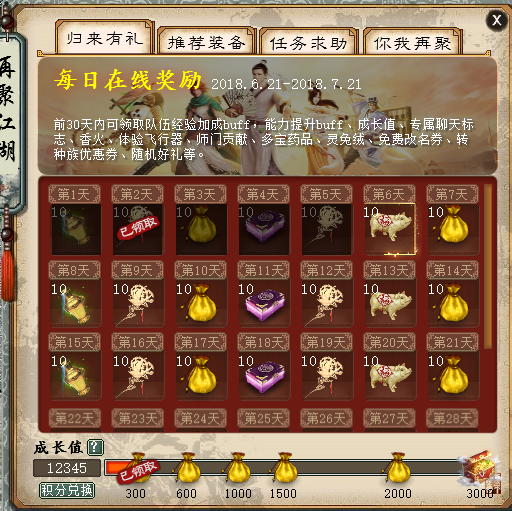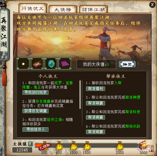 4、增加成长值进度奖励相关:各位大侠和回流玩家组队日常任务、结伴江湖可获得大侠值,大侠值达到一定进度后即可打开宝箱获得奖励哦。