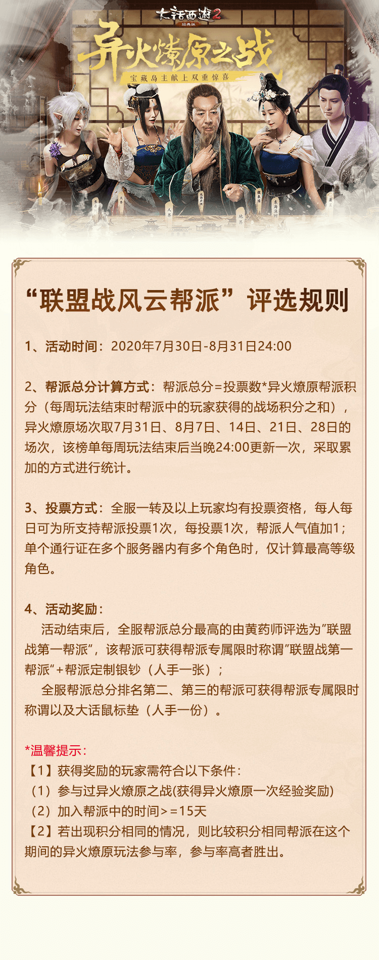 江湖争斗风起云涌,异火燎原激战四野!精彩刺激的“联盟战风云帮派”活动今晚即将迎来最后一次异火燎原之战的赛事积分累计,谁将成为本次活动的最终赢家带走黄岛主送出的帮派专属银钞以及专属称谓?兄弟们今晚一定要积极应战,拿下这份独一无二的荣耀!