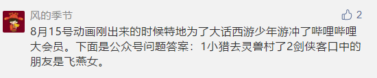 这周二哥又要送福利了。看少年游,拿丰厚福利,何乐而不为?只要大家关注《大话西游2》微信公众号,参与答题活动,正确回答下面两个问题,二哥就会在评论当中送出50个哔哩哔哩大会员!让你们可以在哔哩哔哩提前看动画片第五集!