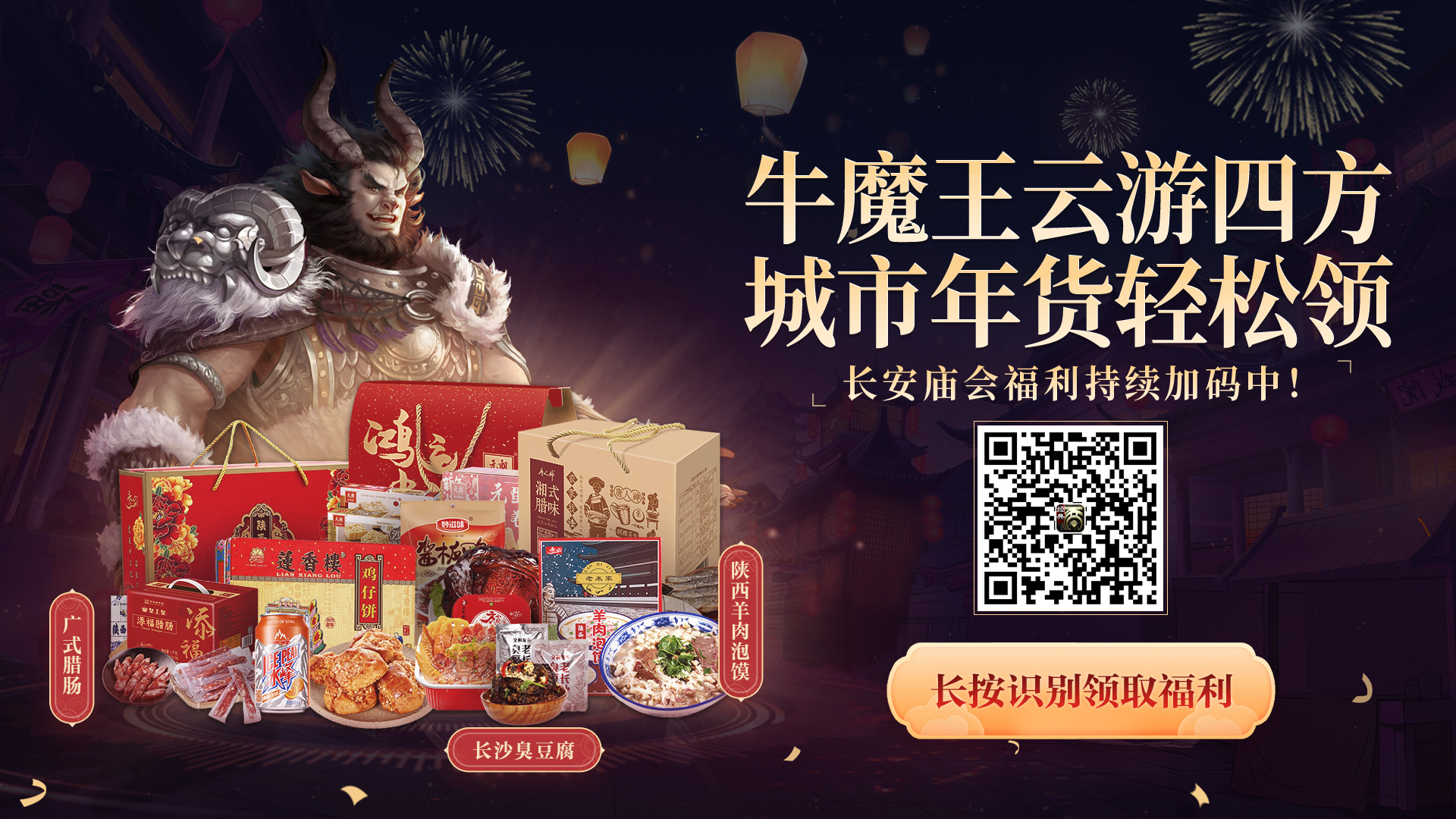 长安庙会里牛魔王乘坐福利巴士巡游长沙、西安、深圳三城,为大家准备了长沙臭豆腐、酱板鸭、幸福西饼无门槛蛋糕卡、冰峰饮料、西安牛羊肉泡馍、陕西特产大礼包、经典广式腊肠、美味鸡仔饼、小龙坎自热火锅以及广东特产大礼包等多重特色年货相送,长安庙会中更有百万点卡雨,外星人15.6寸电竞游戏笔记本、小米电视 82寸巨幕电视、华为MATE 40 PRO、戴森多功能空气净化器、大话X贵州茅台酒(喜宴)、极品穷奇手办、2020鎏金宝鉴典藏版、手办十二藏等重磅好礼在长安庙会奖池之中等着各位!