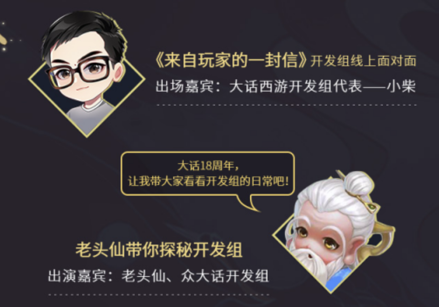 十八年一路走来,大话开发组始终不忘初心,脚踏实地地对游戏进行打磨,力求为玩家们带来更好的游戏体验,让弘扬国风、守护情义的路能够走得更远。此次大话开发组代表——小柴也将在晚会上和所有玩家们一同畅聊大话西游的未来动向,为大家爆料接下来一段时间大话的各种动作。此外,玩家们十分熟悉的老头仙还将以第一视角带领玩家们云探秘开发组的办公室,为大家揭开开发组“不为人知”的日常。