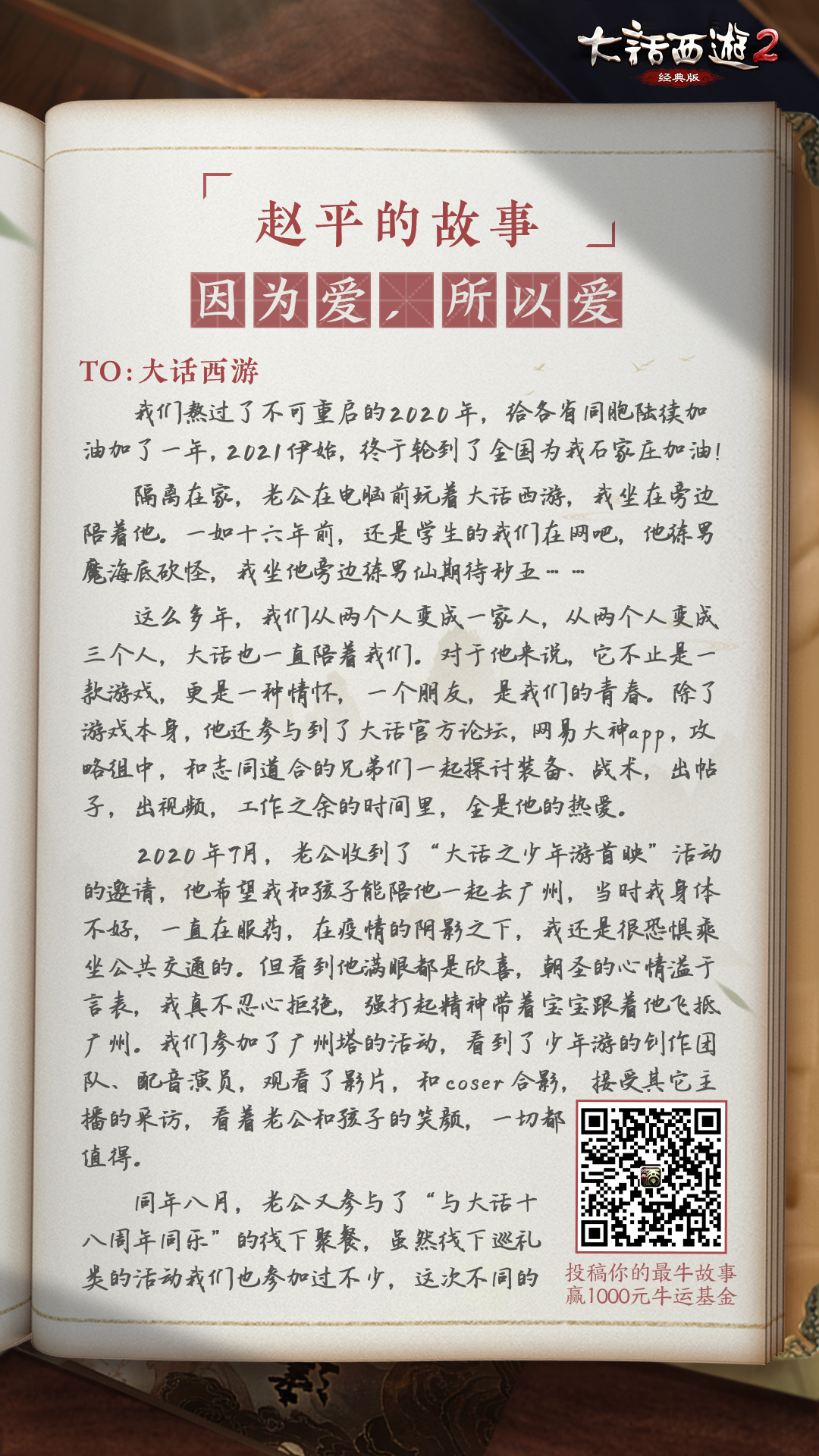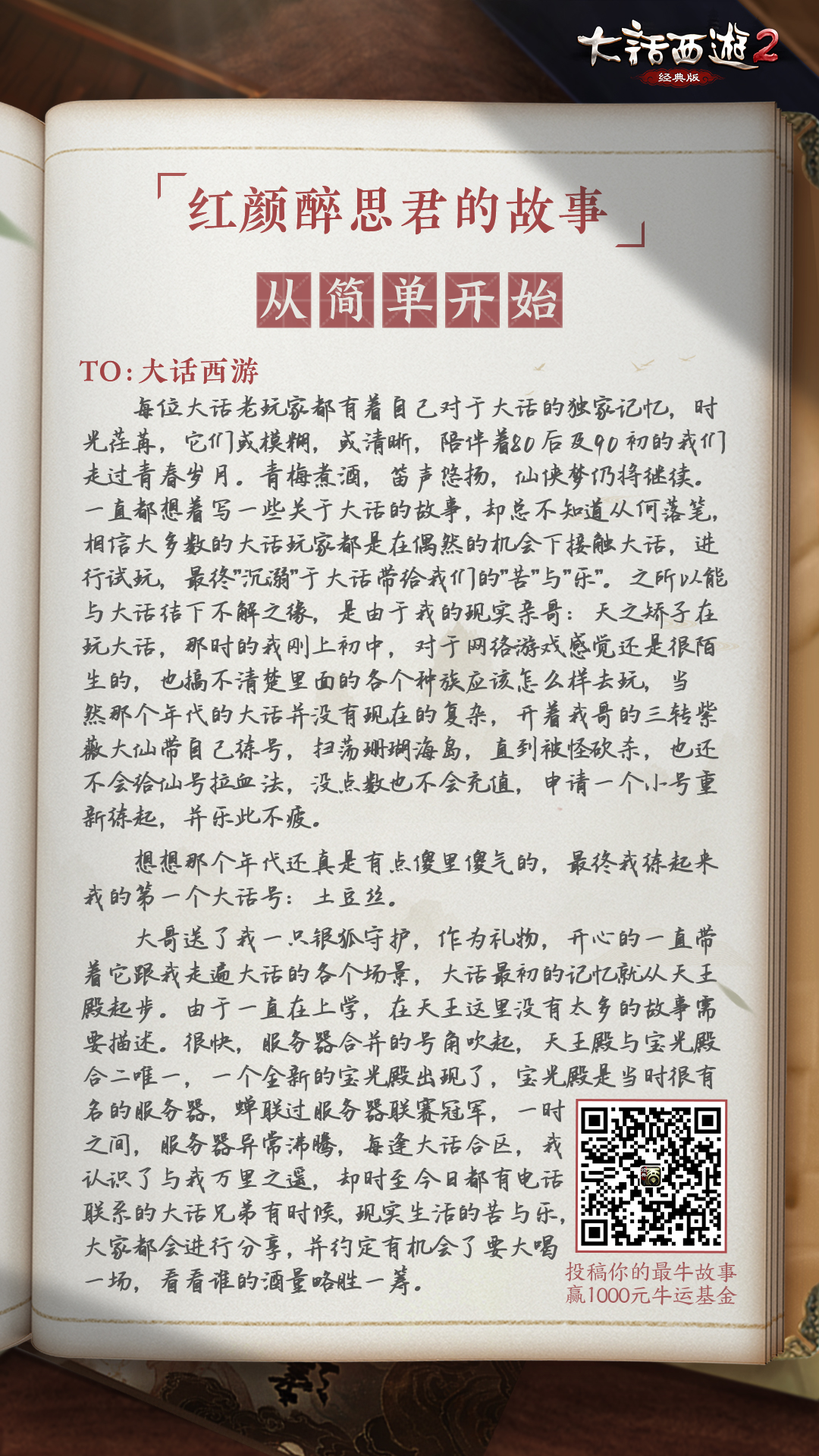 看了他们的故事,你是不是也有话想说?想起这些年的大话岁月,总有一份情感埋藏在你的心里,大话茶馆里烹了热茶,只待少侠你前来一叙!活动截止2021年2月3日,我们期待更多兄弟相聚茶馆,讲述自己的大话故事!