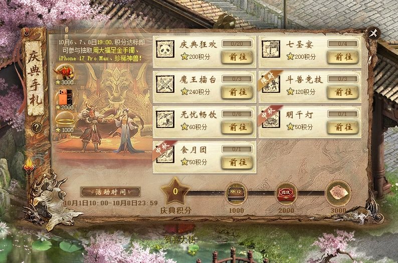 10月7日19:00,将在庆典积分达到2000且在线的少侠中,随机抽取一名获得iPhone 17 Pro Max;