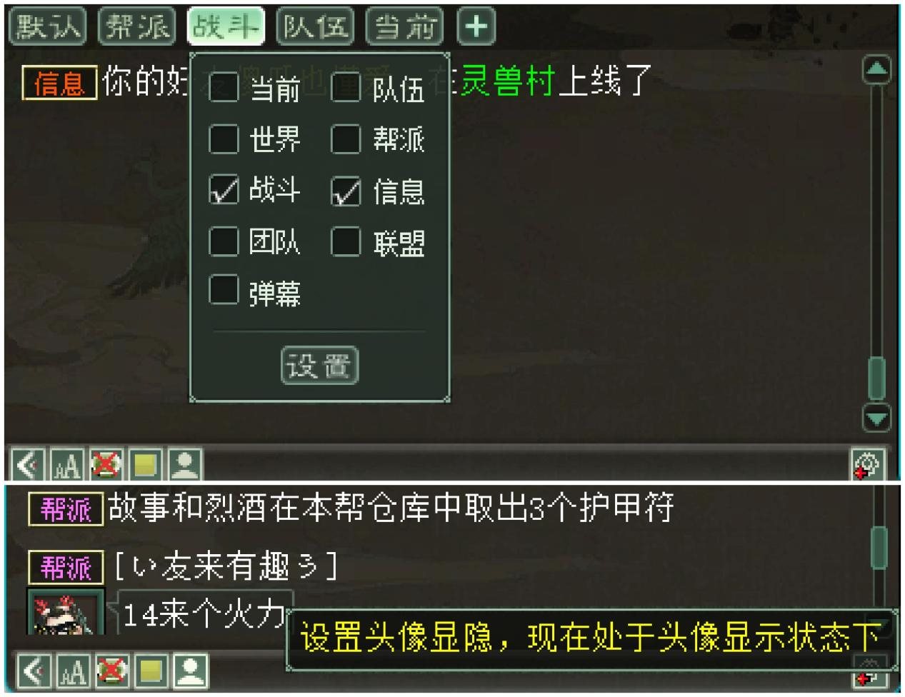 聊天窗口在分屏模式下,频道支持自定义修改频道显示范围以及自定义频道名称,比如我把战斗设置在这个分屏显示,就可以更直观的看到队友操作的法术和怪物提示话语。更多聊天窗口的功能可通过右下角设置按钮进行调整,如:头像显隐设置、底图调整、字号调整等。