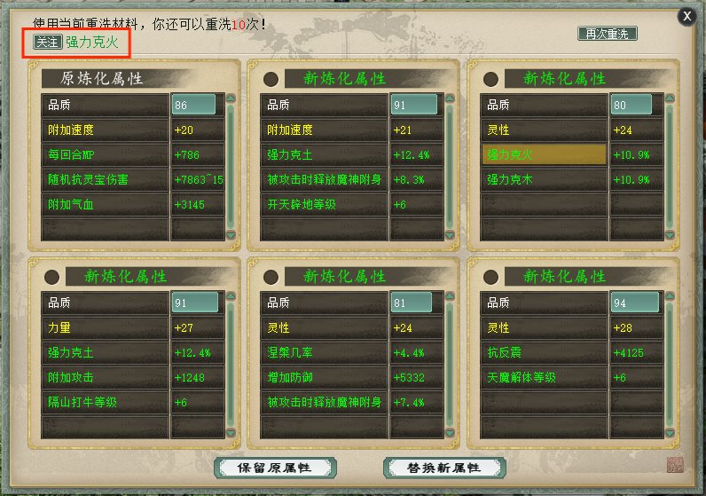 召唤兽装备重铸洗练时不光支持一键五次,更新增了【属性关注】功能,我们可以选择两种模式和最高两种属性进行重点关注,一旦洗练出现关注的属性就会高光提醒,避免一键五次洗练后属性较多看花了眼~