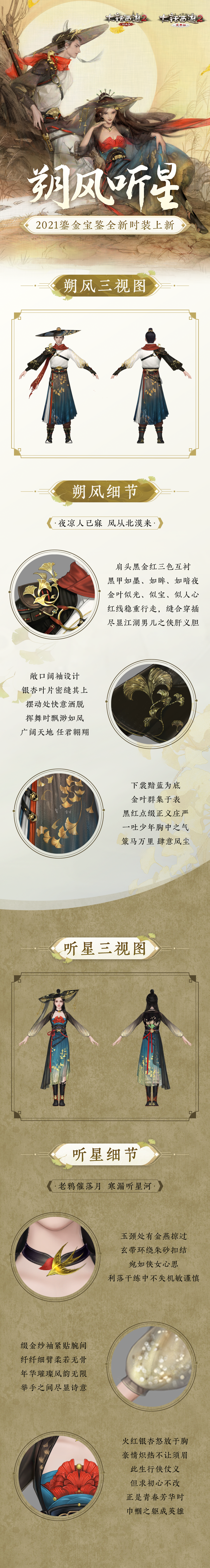 2021鎏金宝鉴新时装日前已全面曝光,男装“朔风”与女装“听星”各具特色、风格独到,其中满满的侠客风元素更是得到了众位少侠的一致好评!