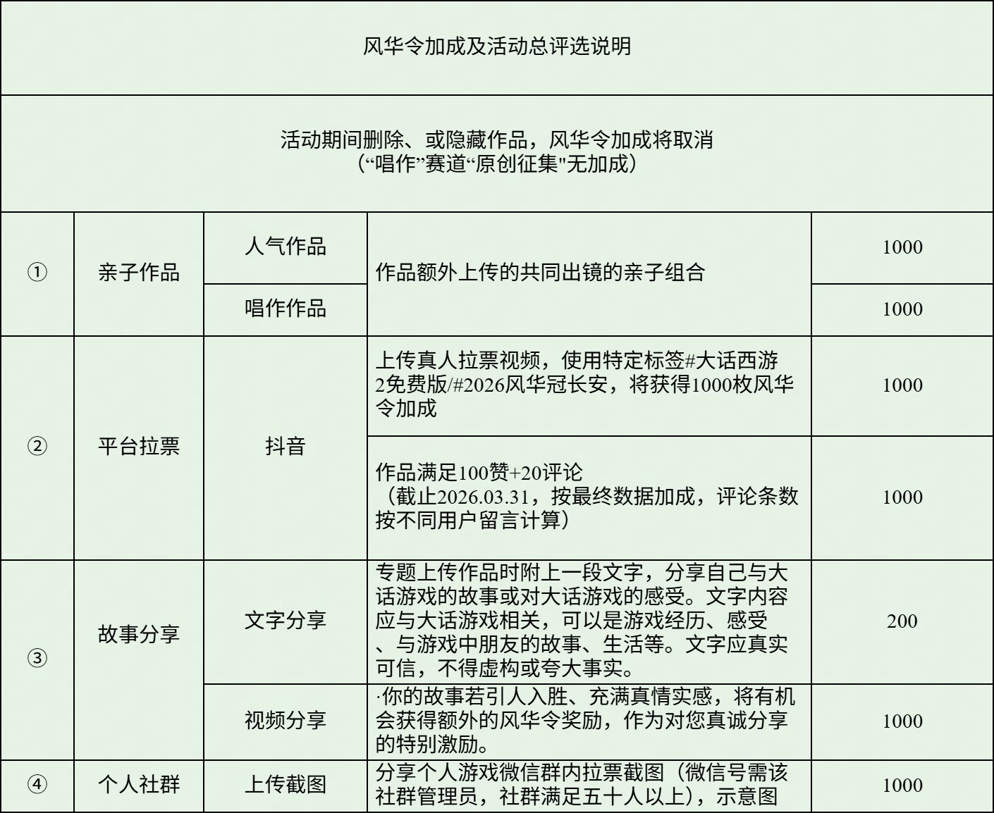 ==》加成类投稿截止日期为3月31日,4月1日至4月3日进行风华令加成,平台拉票的评论条数剔除重复的用户评论数,加成类不包含唱作赛道的“原创征集”类。