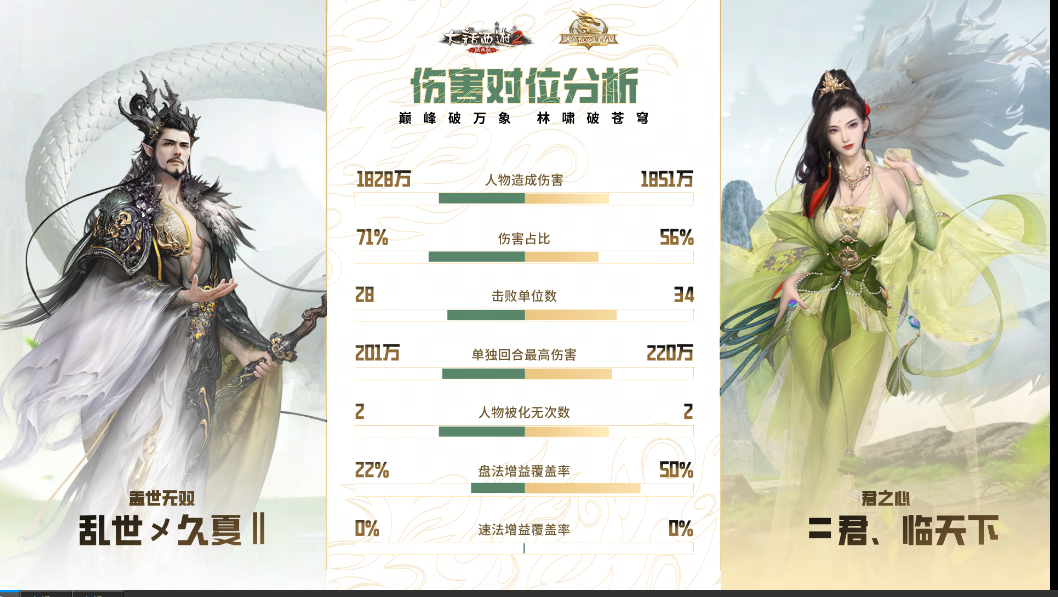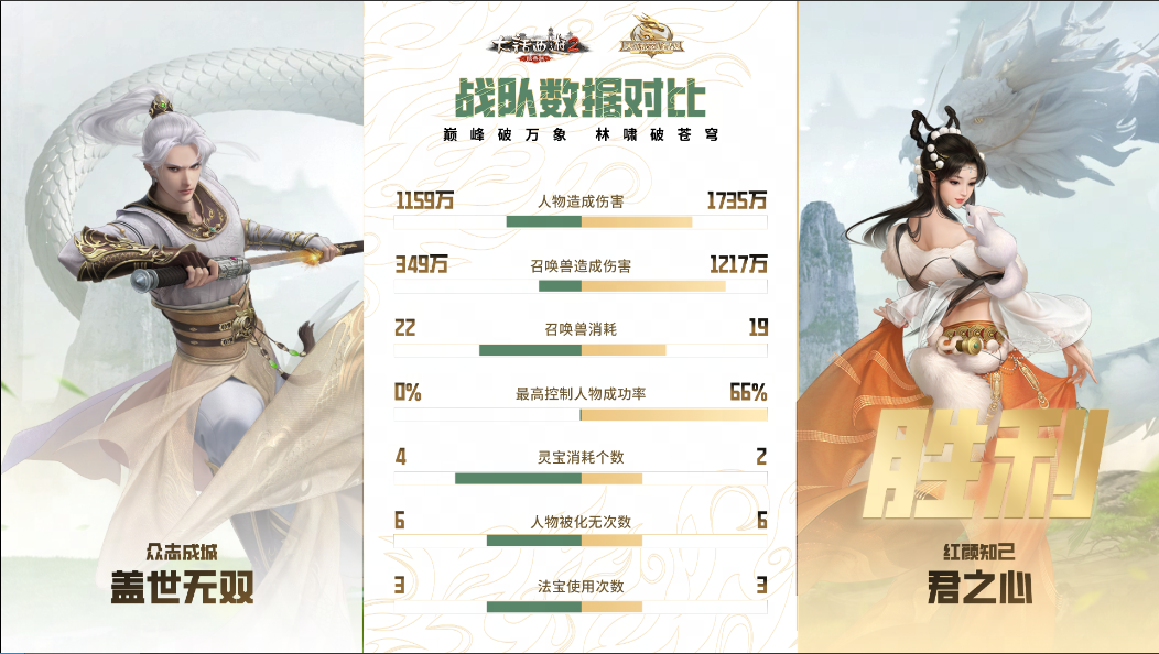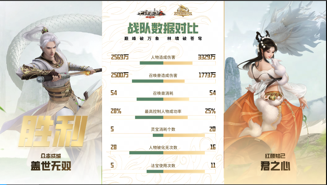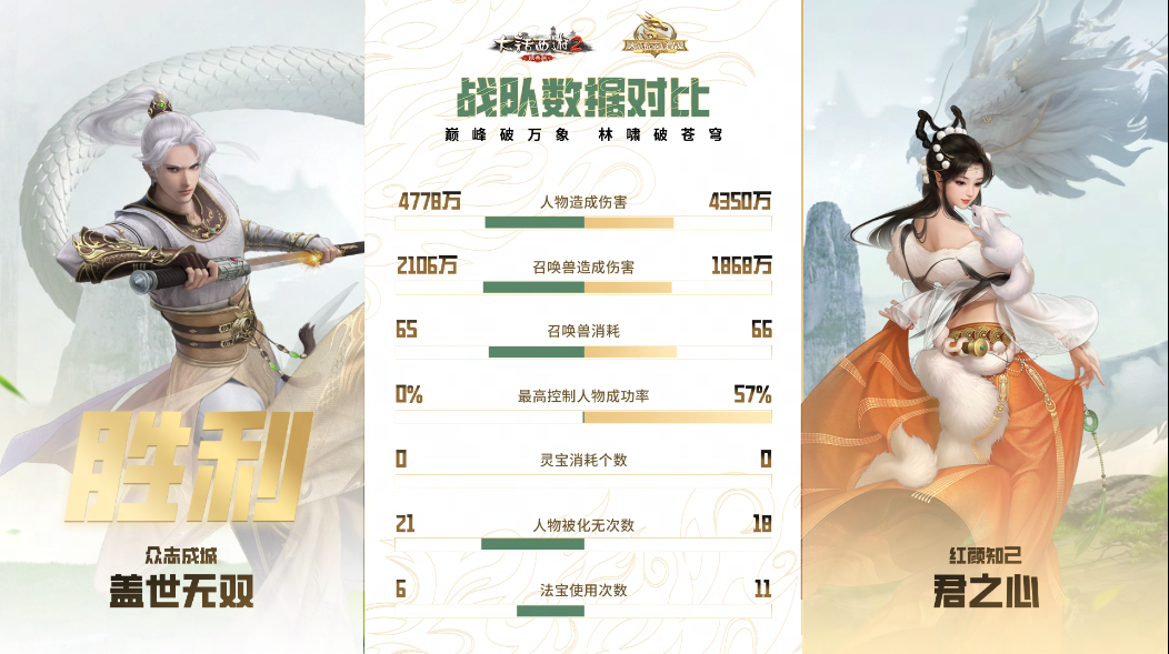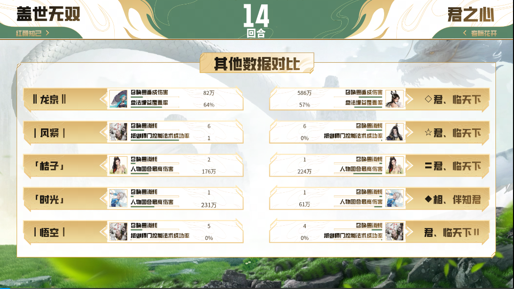 第三场决胜局,“盖世无双”战队进行变阵,上了双男鬼、男龙、男人、女魔的常规血队阵容,“君之心”队伍则延续了上一场的阵型,本场“盖世无双”战队的高敏冰人发挥亮眼,控制得当的情况下也造成召唤兽伤害的大幅领先,这一点从赛后的数据分析可以很明显看到,双方大战40回合后,“盖世无双”成功逆转乾坤,将比分反超至2:1,也成功晋级到天干组决赛当中!