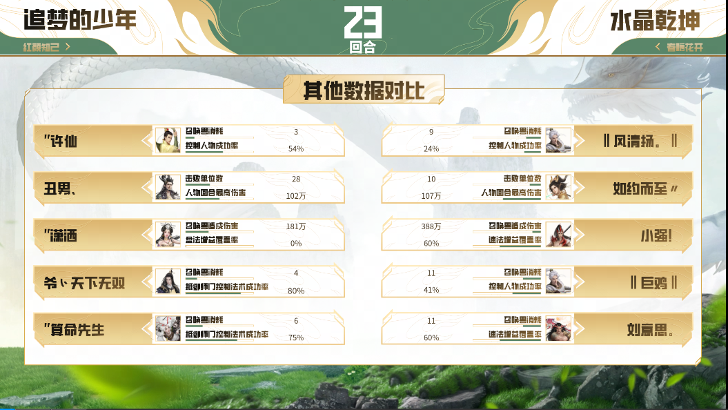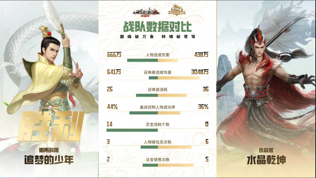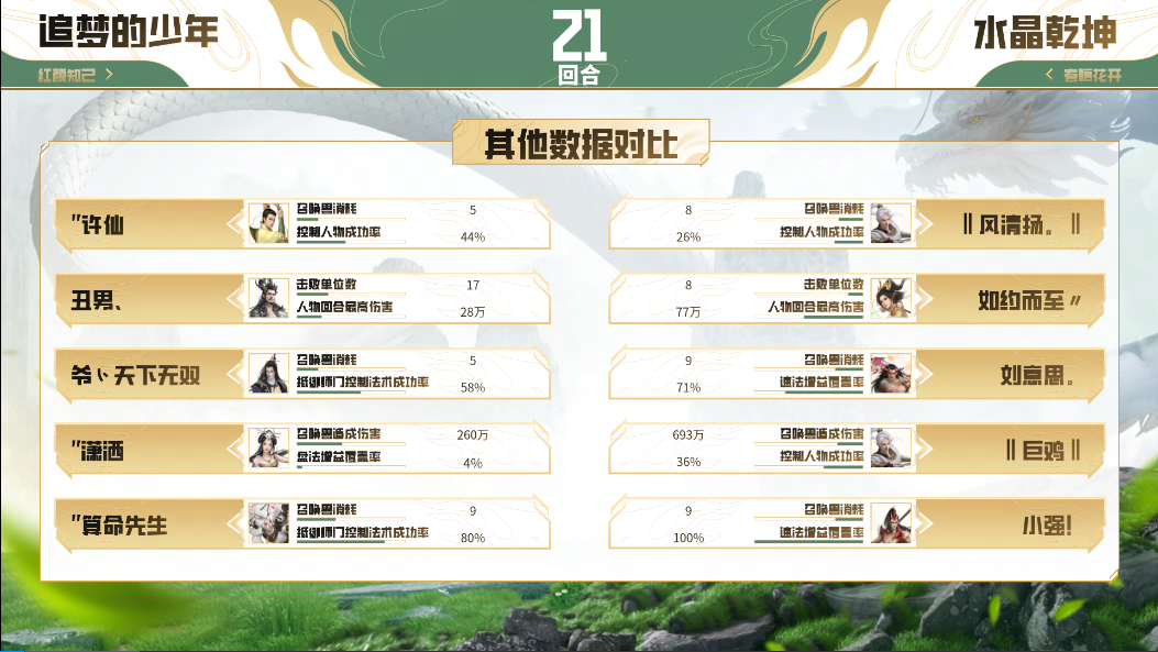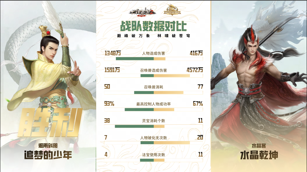 第二场对决,“追梦的少年”战队阵容未曾变化,而“水晶乾坤”战队进行变阵,上了双男魔、双男人、男龙的阵容,这波变阵也为他们带来了不俗的效果,整个中前期都牢牢掌握着主动节奏。23回合时,“水晶乾坤”战队在带速的情况下,魔抽龙秒悍然发动攻势,两只蜘蛛精一鸣加哀兵更是打出大量伤害,洞烛其相又破除画中仙隐身,紧接着男魔三只蛟龙连续登场,又是一轮哀鸣、一鸣、洞烛的组合拳,出乎意料地一波带走对面全部单位,也将比分扳平至1:1!