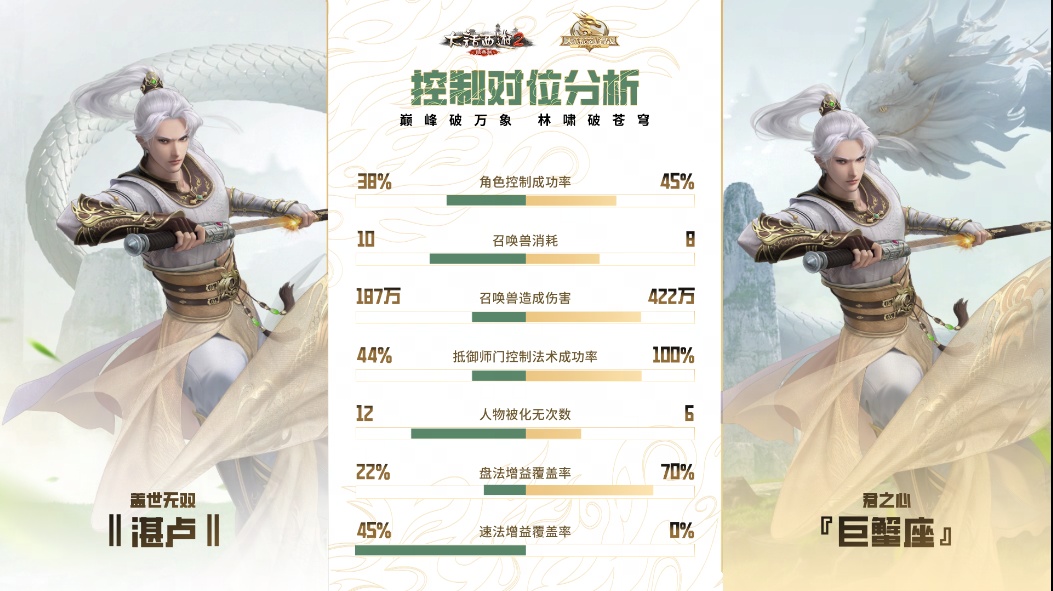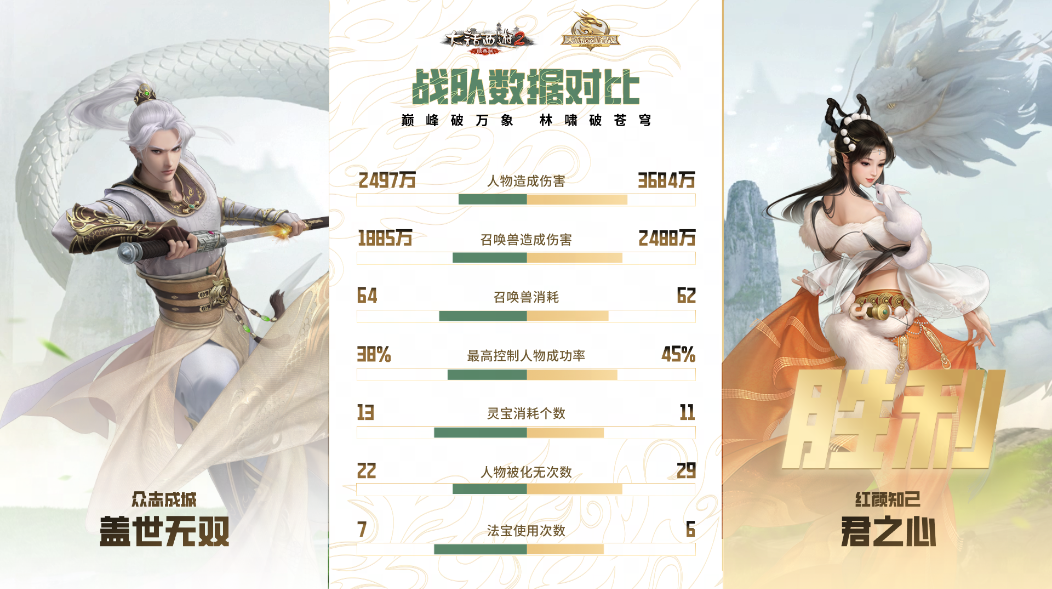 第二场战斗,双方均上了女魔、男人、男龙、双男鬼的阵容,本场“君之心”队伍女魔抢得一速,双鬼及火力敏序在对面鬼龙之后,混男人则为后置出手,整场战斗他们在人物伤害、召唤兽伤害、以及控制成功率上均有明显优势,双方战斗到后期时,“君之心”队伍蹒跚浪淘沙刚好卡住男人敏,连续伤害加附混导致对战位男人无法补给召唤兽,并且在40回合时触发了乾坤遮天,最终他们也已2:0锁定胜局,成功晋级冠军赛!