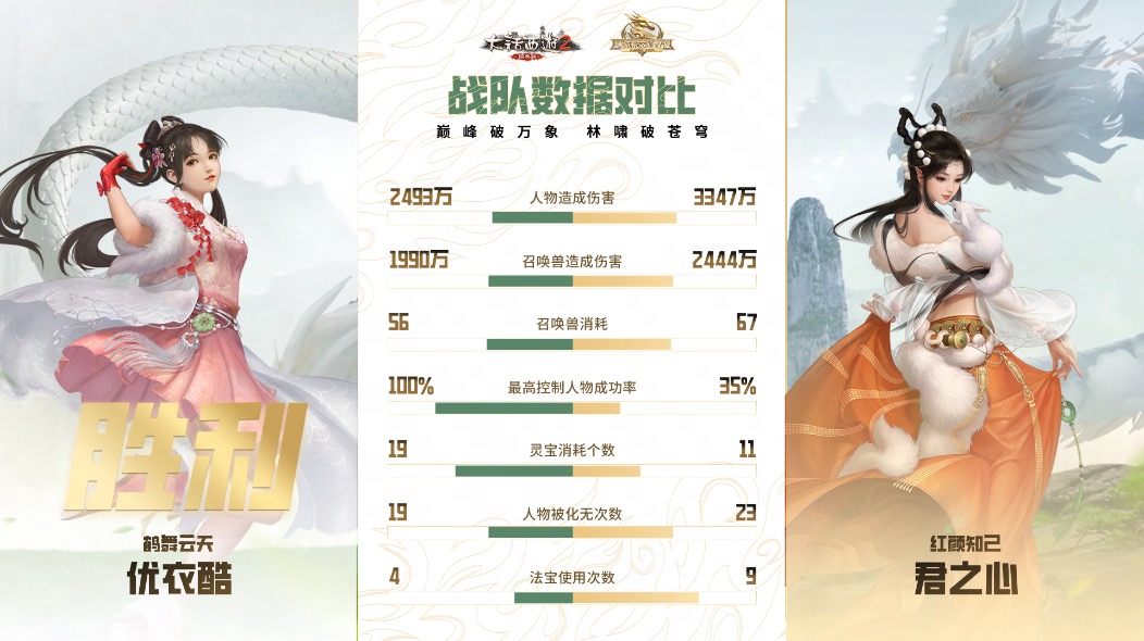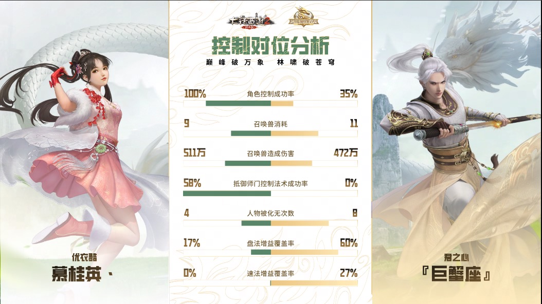 本场“君之心”战队上了双男鬼、女人、女鬼、女魔的阵容,并采取敏序高低配的打法,“优衣酷”战队则安排了女魔、女人、男龙、双男鬼的阵型,本场“优衣酷”战队的大力召唤兽发挥极为出色,在中后期逐渐建立起消耗优势,特别是在40回合决胜时,浪淘沙先是砍倒对面男人致使其灭门,一念圣猿又击倒女魔,最终他们也以在场单位数量的优势拿下胜利!