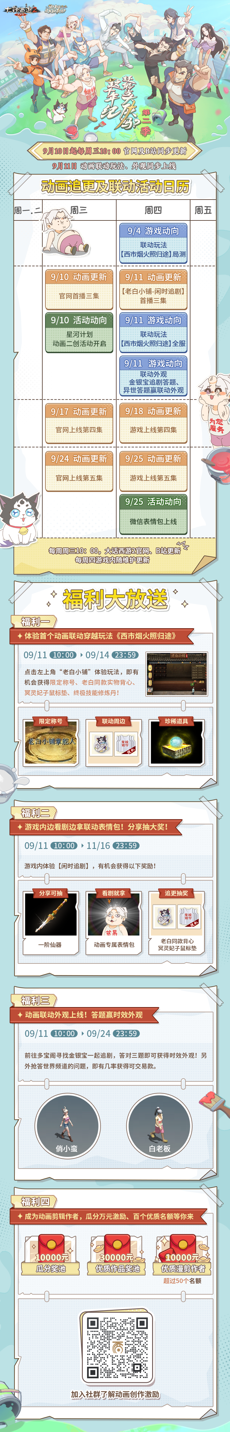 游戏内“闲时追剧”活动也将于9月11日正式开始,观看每集满3分钟,即可免费领取动画专属表情包,累计可获全两季共20个大表情包!此外还有机会抽取老白同款实物背心、冥灵妃子鼠标垫等珍贵奖励,分享动画至聊天频道更可能赢取一阶仙器!