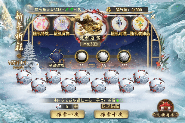 累计赐福:当少侠累计探索达到88、188、388个玉灵雪球时,可分别达成灵兽赐福·初/中/满阶段。可以领取各阶对应的节日专属功绩:鸿雪有期、雪径印约、共雪千山。