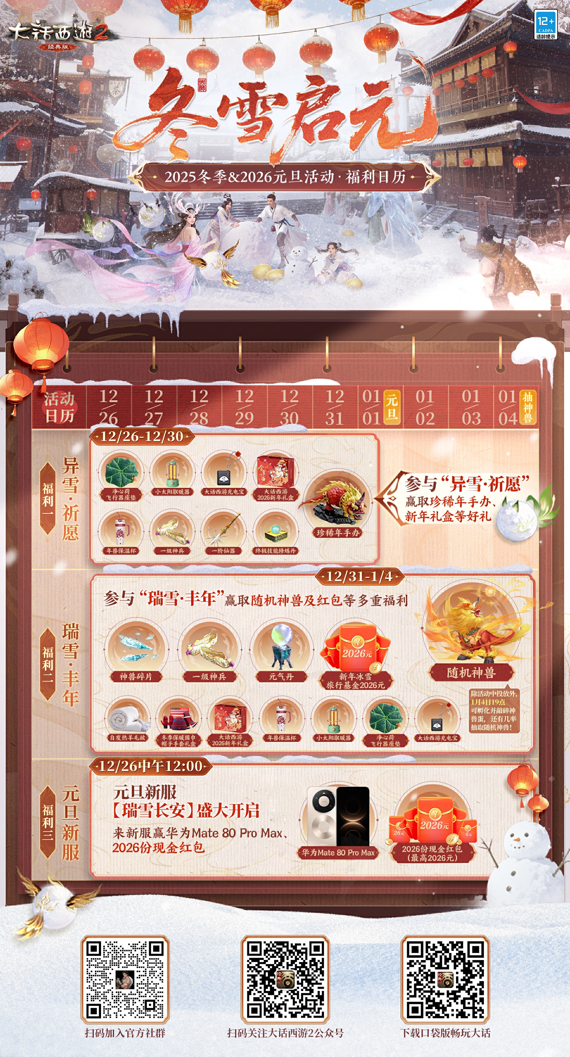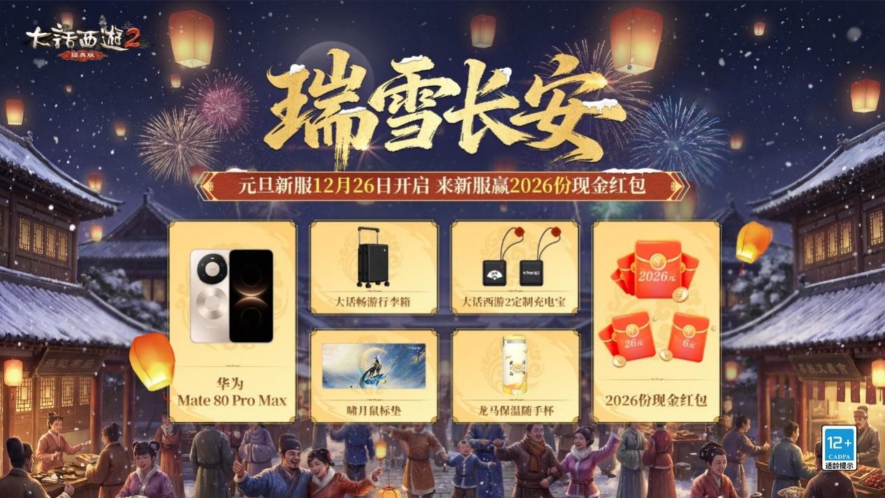 明日(12月26日)中午12:00,元旦新服【瑞雪长安】重磅开启!参与新服活动赢华为Mate80Pro Max、2026份现金红包等多重好礼,更有减负优化内容全面上线,开服即送满成长率的新手召唤兽,大幅提升了仙缘盛会等多重新服活动的经验奖励,效率提升不爆肝!