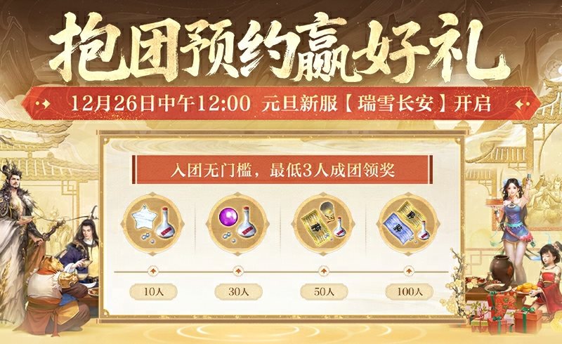 元旦新服【瑞雪长安】火热预约中,少侠快叫上兄弟一起抱团预约,最低3人成团领奖,更有神兵抽奖券等好礼相送!