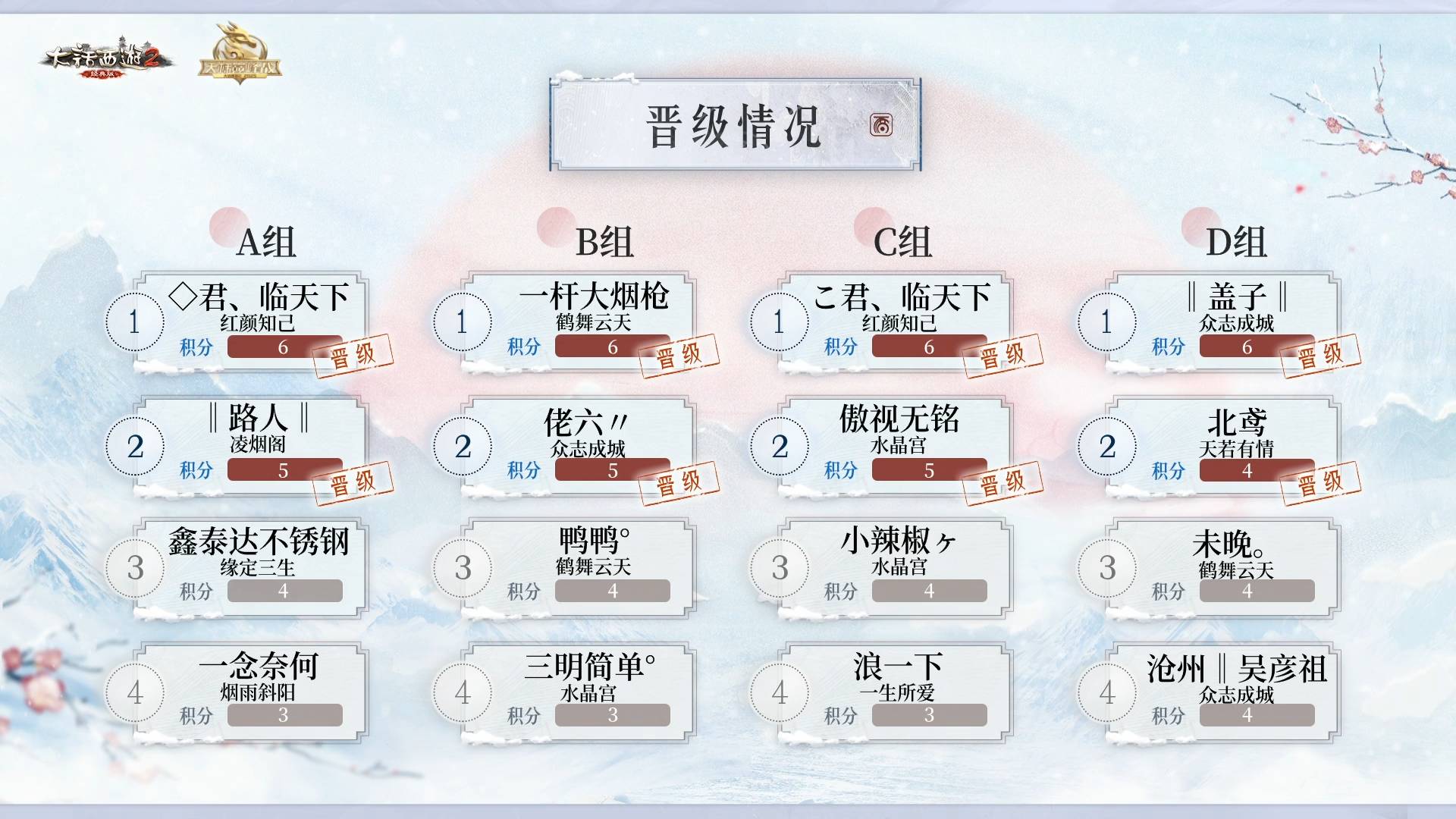 八强淘汰赛结束后,红颜知己服务器“◇君、临天下”、凌烟阁服务器“‖路人‖”、鹤舞云天服务器“一杆大烟枪”、众志成城服务器“佬六〃”、红颜知己服务器“こ君、临天下”、水晶宫服务器“傲视无铭”、众志成城服务器“‖盖子‖”、天若有情服务器“北鸢”所率领的战队晋级八强,同时神威组与棋弈组也决出了各自胜者,顺利进入下一轮!