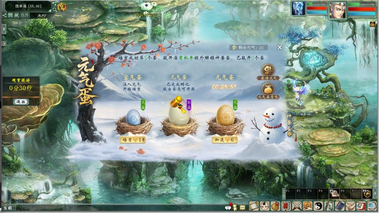 活动期间10:30~12:30、18:30~22:30每个半点时分十分钟内,少侠可单人或组队前往巫晴处参与推雪球大赛,练习技巧来控制滚动雪球。获得雪球积分,可以在巫晴处兑换各类好礼,不仅有几率获得元气蛋和元气奖励,更有功绩奖励等你!