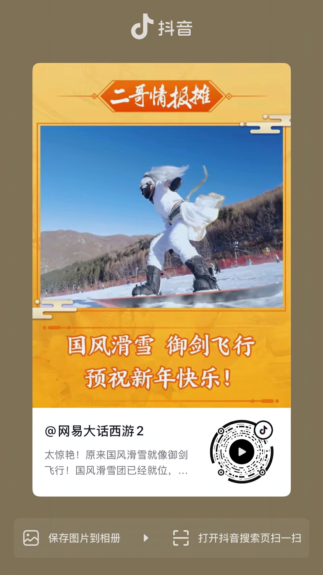 想要亲身前往体验的少侠,只需扫描下方二维码前往【大话西游2】公众号或【网易大话西游2】抖音号,为本篇文章内的视频点赞,并在视频下方进行留言互动,就有机会赢取单张价值近千元的1天含全套装备滑雪票(本雪季内工作日、周末、节假日含春节均可用)!还有机会赢取2026大话西游新年礼盒!机会难得,快来参加!